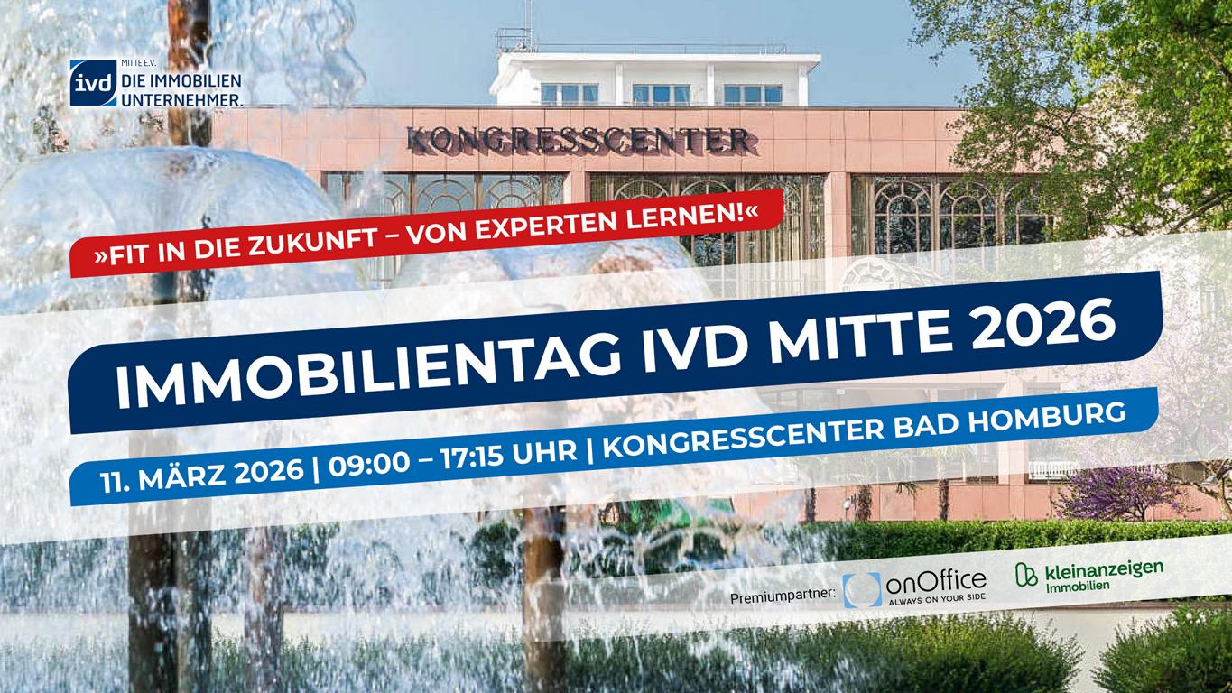 Seien Sie dabei, wenn am Mittwoch, 11.03.2026, der Immobilientag des IVD Mitte im KongressCenter in Bad Homburg stattfindet. Das Motto des diesjährigen Branchentreffens lautet „Fit in die Zukunft – von Experten lernen!“.